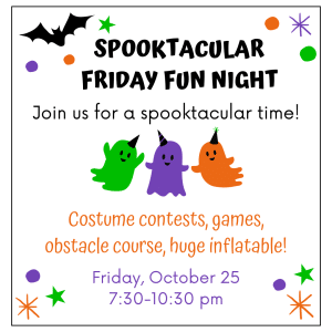 Tricks….and Treats! Join us for a costume contest, games, and prizes! Bring the kids to our Spooktacular and get a night out for your own Halloween fun!